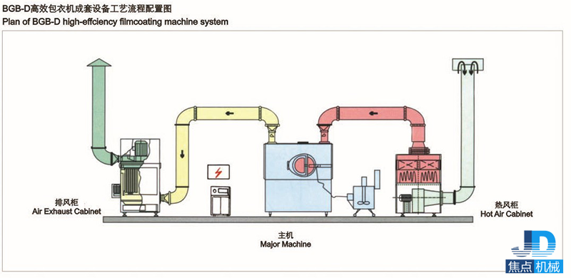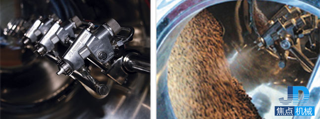片芯在包衣機(jī)潔凈密閉的旋轉(zhuǎn)滾筒內(nèi),不停地作復(fù)雜軌跡運動,翻轉(zhuǎn)流暢,交換頻繁,按工藝流程和合理的工藝參數(shù)自動噴灑包衣介質(zhì),同時熱風(fēng)供給在排風(fēng)和負(fù)壓作用下,穿過片芯從底部篩孔排出,使包衣介質(zhì)在片芯表面快速干燥,形成堅固、致密、光滑的表面薄膜。