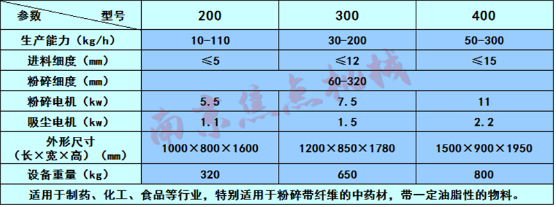 該機組適用于制藥﹑食品﹑化工等行業。具有風冷﹑無篩網等多種性能,它不受物料粘度,軟硬度及纖維適用于粉碎帶纖維的中藥材,帶一定油性的物料。