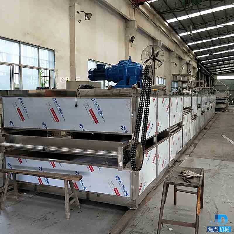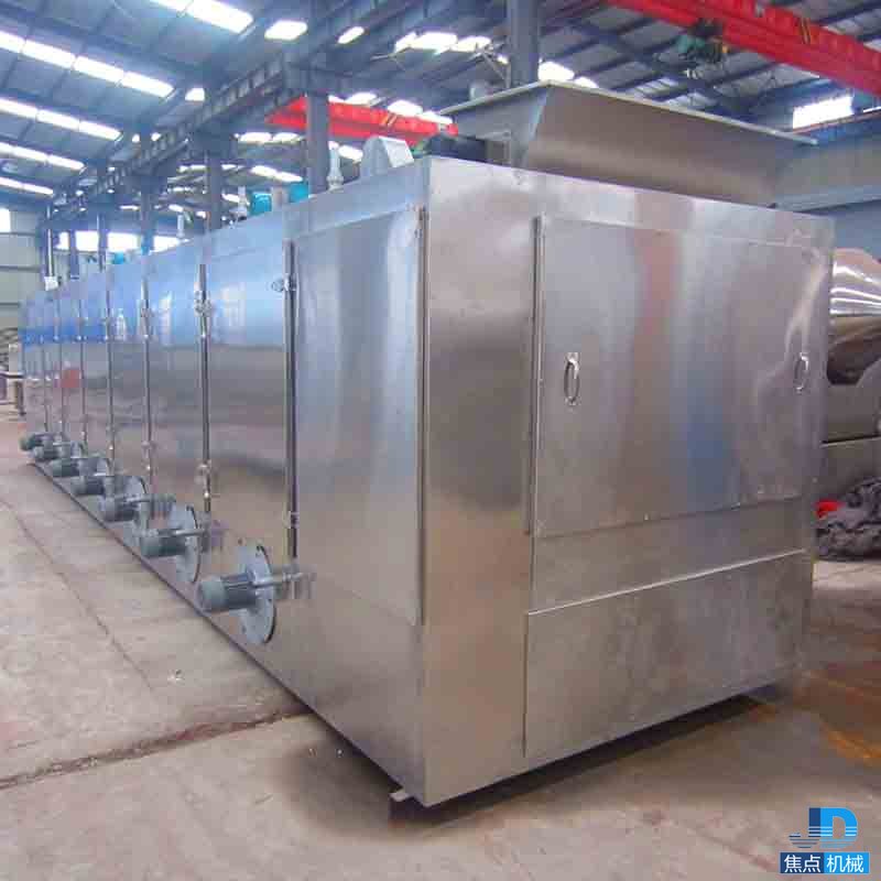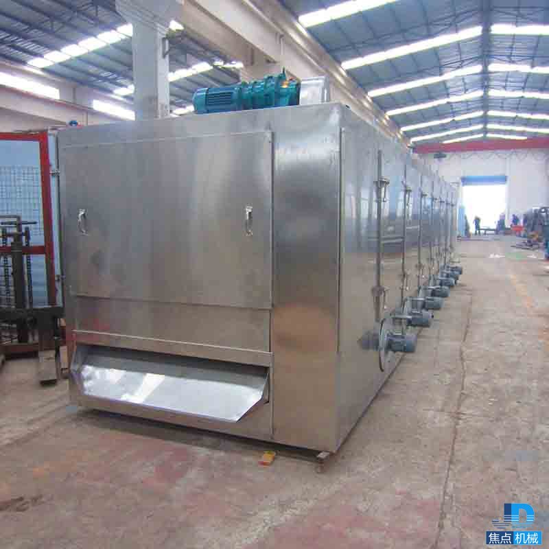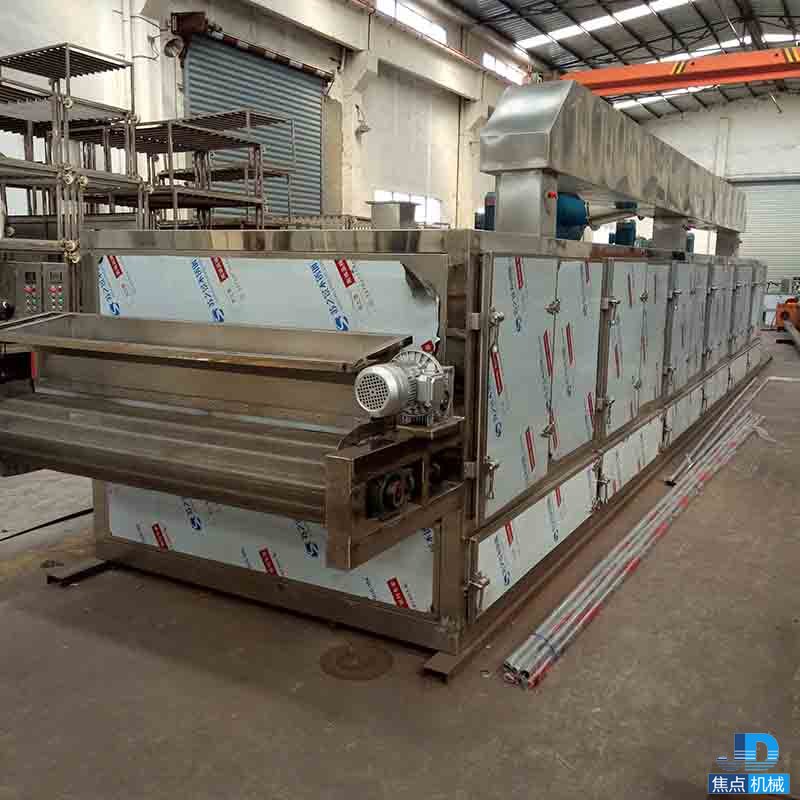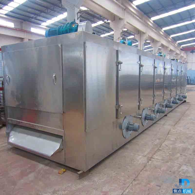 物料由加料器均勻地鋪在網帶上,網帶一般采用12-60目不銹鋼絲網,由傳動裝置拖動在干燥機內移動。干燥機由若干單元組成,每一單元熱風獨立循環,部分尾氣由專門排濕風機排出,廢氣由調節閥控制,熱氣由下往上或由上往下穿過鋪滿物料的網帶完成熱量與質量傳遞的進程,帶走物料水份。網帶緩慢移動,運行速度可根據物料溫度自由調節,干燥后的成品連續落入收料器中。上下循環單元根據用戶需要可靈活配備,單元數量亦可根據需要選取。
