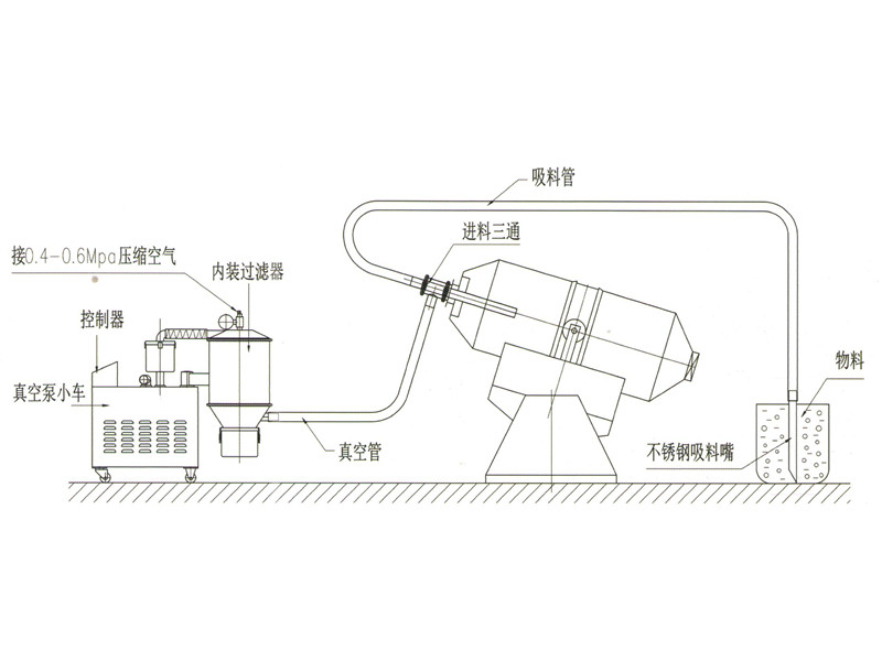 電動真空加料機由電動氣泵工作使密閉容積(如V型混合機、二維混合機、三維混合機等)產生真空即負壓,這樣真空加料機將通過輸料管從儲料倉中將物料吸入密閉容積內,再經過過濾器將氣物分離,上料時間由PCB控制器決定,吸料結束,反吹裝置將反吹吸附在過濾器上的粉末,將粉末清除掉。下一個循環開始。